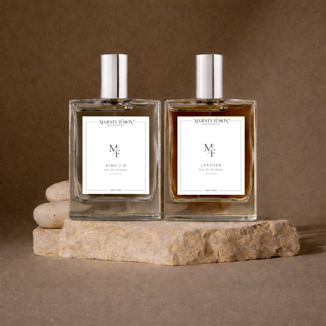 Experience the perfect blend of freshness and power with this Extrait de Parfum duo (20–25% concentration). King delivers a refined oriental woody-floral vibe with black currant, rose, citrus, and warm vanilla musk — smooth, versatile, and perfect for office or special occasions. Leather brings bold intensity with rich leather, cardamom, amber, and patchouli — a beast mode fragrance made for meetings, winter evenings, and statement moments.